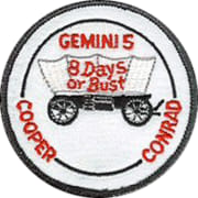 Nel 1965 avviene il lancio della Gemini 5 (con a bordo Conrad e Cooper) che orbitò attorno alla Terra per 120 volte. Il logo rappresenta un carro da pionieri che simboleggia le nuove missioni spaziali con manovre di spostamento di orbita e posizionamento mai provate fino ad allora. La scritta ” 8 Days or Bust” è il motto della missione che significava otto giorni in orbita rispettando il programma o il fallimento. I loghi stanno diventando sempre più rappresentativi nelle missioni spaziali e con le missioni Apollo saranno molto più ricercati.