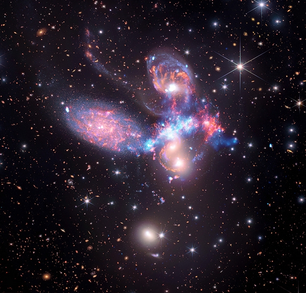 In 2006 NASA issued a press release according to which the Chandra X-Ray Observatory would have found direct evidence of the existence of dark matter in the collision between two clusters of galaxies (see photo above). We share the official release from NASA (click here) and the photo of the galaxy cluster 1E 0657-56, also known as the “bullet cluster”. Recently, the James Webb infrared space telescope collaborated with the Chandra space telescope, emphasizing how the power of any of these telescopes is enhanced when combined with others. Here we see the result of this collaboration: