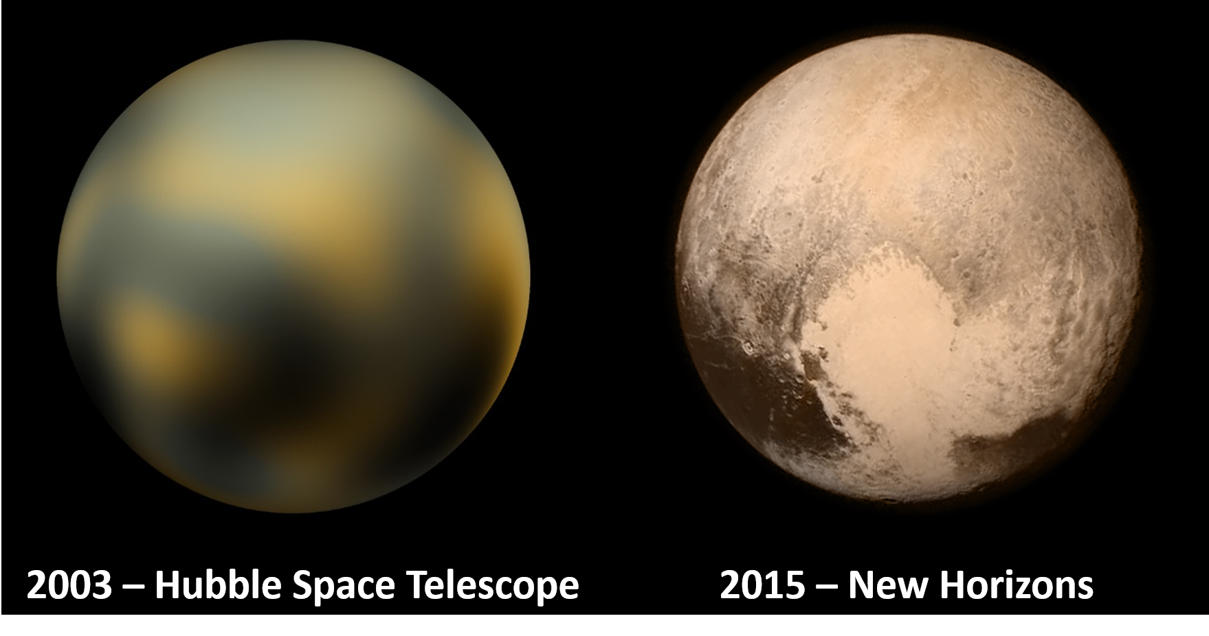 In 1996 the Hubble Space Telescope (HST) took the first photograph of Pluto’s surface, let’s compare it with the most recent photo from New Horizon, wow what a difference!