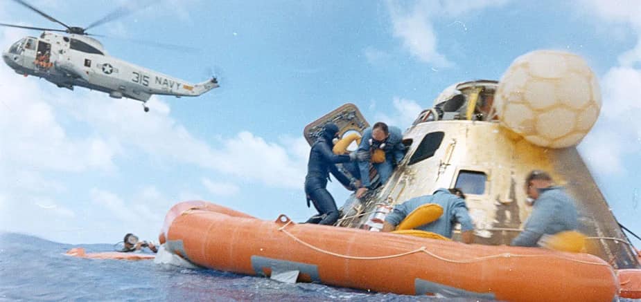 Nel 1969 – Programma Apollo: l’Apollo 12 ammara nell’Oceano Pacifico (vedi foto) ponendo fine alla seconda missione dell’uomo sulla Luna. Nell’impatto di ammaraggio, avvenuto alle 20:58 a 800 km a est delle Samoa, una videocamera da 16 mm sganciandosi dal suo supporto provocò una ferita al capo e una commozione cerebrale a Bean, che perse conoscenza senza subire gravi conseguenze; in seguito gli furono applicati 6 punti di sutura in fronte. Il Modulo di Comando e l’equipaggio dell’Apollo 12 furono recuperati dalla portaerei statunitense USS Hornet e trasportati a Pago Pago dove per via aerea raggiunsero Honolulu con un cargo C-141. La nave Hornet è oggi in esposizione in un museo ad Alameda, in California. Il Modulo di Comando è invece al Virginia Air and Space Center, a Hampton.