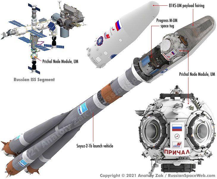 In 2021 launch Soyuz 2.1b – Progress MS-UM (Uzlovoy Module “Prichal”), a node added to the Russian part of the International Space Station (ISS) via a modified Progress, called Progress-M-UM and attached to the lower hatch of the module MLM (Nauka), providing four additional hatches for the addition of as many modules and a hatch for docking cargo or manned vehicles