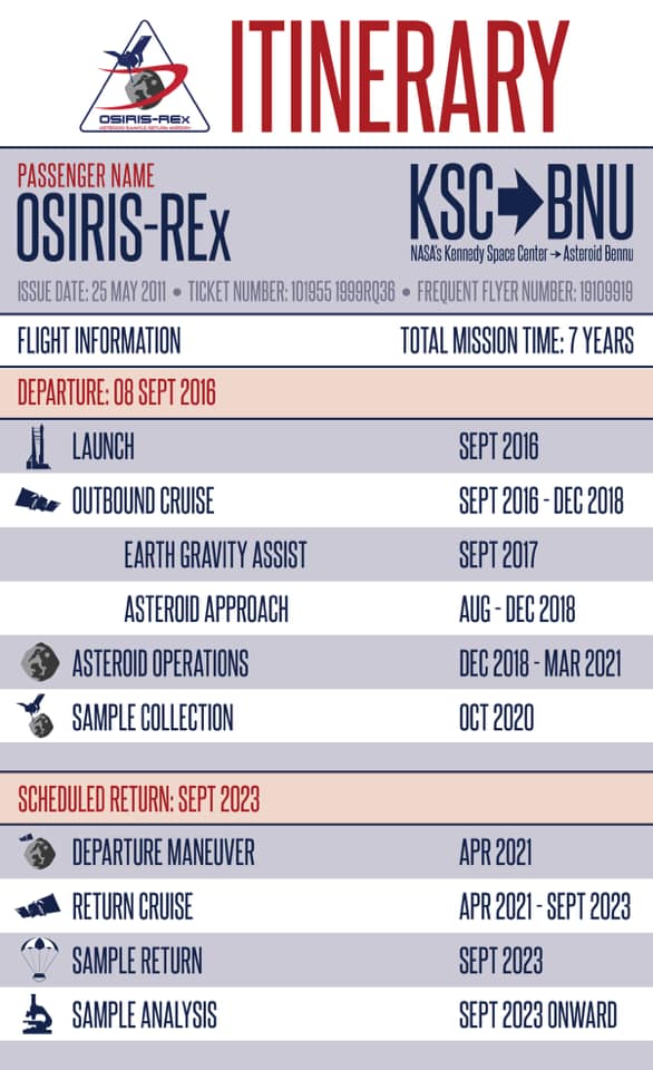Nel 2021 inizia il viaggio di ritorno alle 22:00 – 23:00 di OSIRIS-REX (vedi foto) da Bennu. Dopo aver viaggiato per più di due anni, la sonda è arrivata in prossimità dell’asteroide 101955 Bennu il 3 dicembre 2018 e il 31 dicembre 2018 ha iniziato 505 giorni di mappatura della superficie a una distanza di circa 5 km. I risultati della mappatura sono stati utilizzati dal team della missione per selezionare il sito da cui prelevare il campione della superficie dell’asteroide. La sonda ha prelevato i campioni di regolite il 20 ottobre 2020 alle ore 22.12 UTC, senza atterrare ma estendendo un braccio robotico.