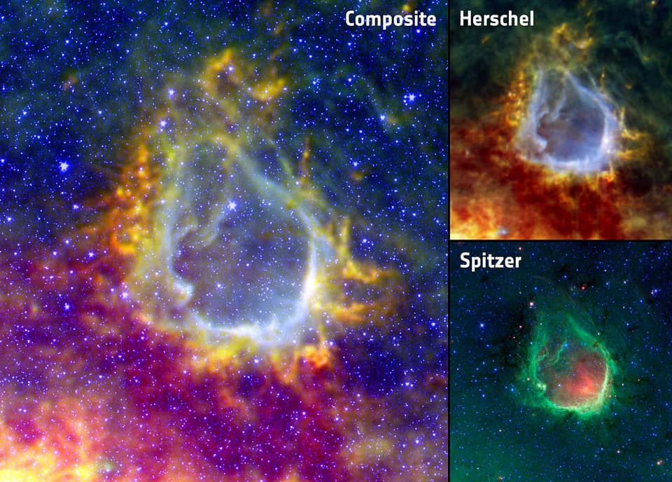 Equipped with a 3.5-metre telescope, Herschel was the largest space observatory ever put into orbit now surpassed by the now-in-orbit James Webb Telescope and of which we await huge surprises (and we can’t wait!). The three instruments at the focal plane, the Pacs and Spire spectrophotometric cameras and the HiFi high-resolution spectrometer, have allowed the exploration of the infrared sky on a scale of distances ranging from the Solar System to the high-redshift Universe. The participation of the National Institute of Astrophysics was important, with the development of the on-board software for the three instruments, the production of the acousto-optic filter and with a considerable scientific commitment in the observational “key projects”. Herschel peered into the glow of cool cosmic dust embedded in clouds of interstellar gas providing astronomers with an unprecedented window into stellar incubators in our galaxy. Precisely thanks to this enormous and powerful telescope and to detectors cooled just above absolute zero, the satellite was able to perform observations with a unique sensitivity, going beyond the gaseous tangle of the clouds where stars form. All this is possible only thanks to infrared. Herschel was also able to trace the presence of water in extrasolar planetary systems, detecting this crucial molecule in star-forming clouds, identifying for the first time the process that brought water from interplanetary debris to the solar system. He was the first to detect water vapor within the Tw Hydrae protoplanetary disk, recording the abundance of water in the early stages of protoplanetary disk formation. I add a combination of photos from the Herschel/Spitzer space telescopes of the nebula RCW 120 called the “perfect nebula” HII region in Scorpius.