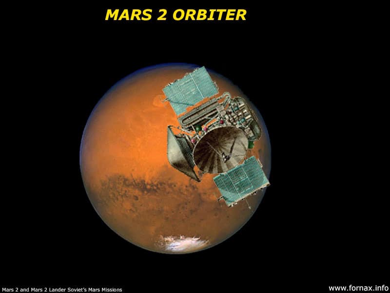 Nel 1971 avviene il lancio della sonda sovietica Mars 2. Il lander di Mars 2 fu il primo oggetto costruito dall’uomo a impattare con la superficie del pianeta rosso. Le immagini e i dati inviati dall’orbiter rivelarono la presenza di montagne alte ben 22 km, l’esistenza di tempeste di sabbia alte fino a 7 km, temperature superficiali comprese tra -110 °C e +13 °C, l’esistenza di idrogeno e ossigeno atomico nell’atmosfera superiore, una concentrazione di acqua 5.000 volte inferiore a quella terrestre, una pressione superficiale di 5,5-6 mbar e la presenza di una ionosfera a partire da 80–110 km di quota. Inoltre le immagini riprese permisero di realizzare una prima mappa della superficie marziana. Il lander si schiantò sulla superficie poichè dopo l’ingresso nell’atmosfera, ad una velocità di circa 6 km/s, funzionò male il sistema di discesa controllata, forse a causa dell’angolo di entrata troppo stretto e non fu possibile l’apertura del paracadute.