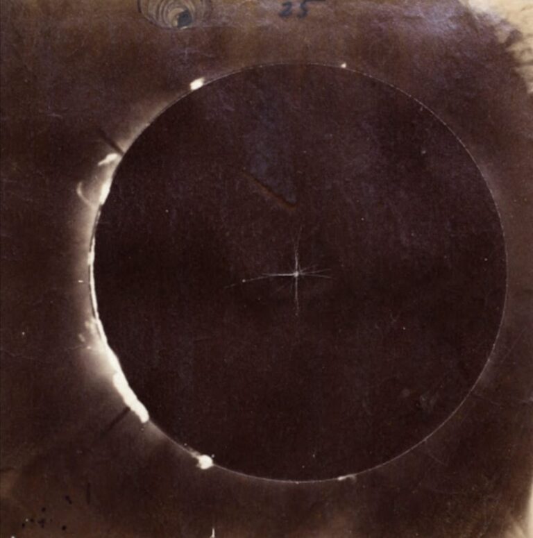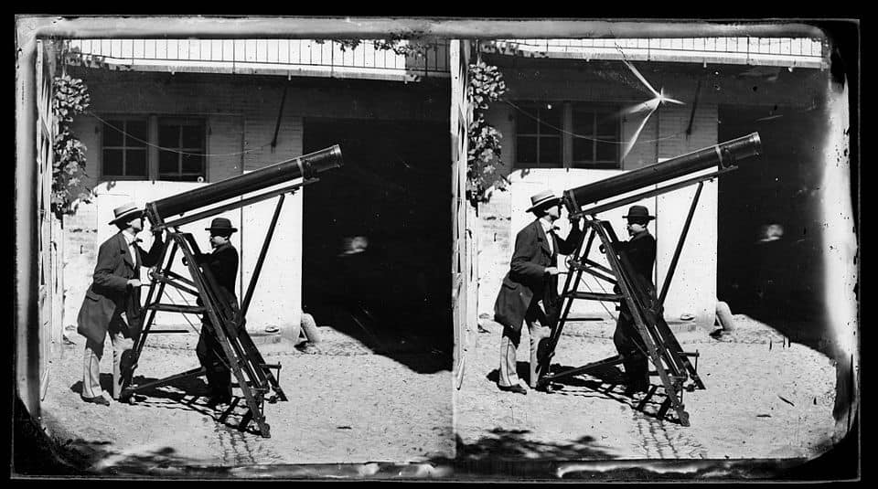 Nel 1860 viene fotografata per la prima volta un’eclisse di Sole e la corona solare (da W. De La Rue). La foto a destra mostra persone intente a osservare l’evento di eclissi del 18 luglio 1860 ritratte da Eugène Trutat. Tecnica del piatto negativo stereoscopico a collodio umido