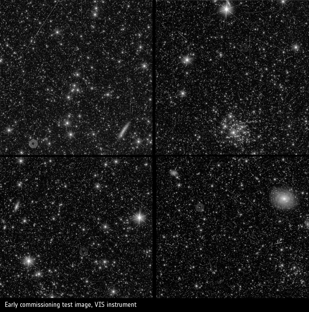 Oggi (2023) vengono rilasciate da ESA – NASA le prime immagini del telescopio spaziale Euclid che ha raggiunto il 28 luglio il suo punto di osservazione definito a 1,5 milioni di chilometri dalla Terra, nel punto di equilibrio Lagrange 2, o L2, dove le influenze di Sole, Luna e Terra vengono annullate. Il direttore generale dell’Esa Josef Aschbacher si dice “del tutto fiducioso che la squadra di questa missione avrà successo nell’utilizzare Euclid per rivelare il 95% dell’Universo, del quale attualmente conosciamo tanto poco”. Questa immagine test sopra è stata realizzata con lo strumento NISP (Near-Infrared Spectrometer and Photometer) ed è stata realizzata per verificare che, una volta messo a fuoco, lo strumento funzionasse come previsto. In questa immagine possiamo notare galassie a spirale ed ellittiche, stelle vicine e lontane, ammassi stellari con un dettaglio incredibile. NISP osserva nelle frequenze del vicino infrarosso (900–2000 nm). Per realizzare questa immagine, Euclid ha raccolto la luce per circa 100 secondi (poco meno di 2 minuti). Si tratta di un’immagine non elaborata come si vede dai segni dei raggi cosmici. La seconda immagine è dello strumento VIS, lo strumento che osserva nel visibile.