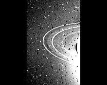 @NASA This pair of Voyager 2 images (FDS 11446.21 and 11448.10), two 591-s exposures obtained through the clear filter of the wide angle camera, show the full ring system with the highest sensitivity. Visible in this figure are the bright, narrow N53 and N63 rings, the diffuse N42 ring, and (faintly) the plateau outside of the N53 ring (with its slight brightening near 57,500 km). The original NASA image has been cropped.
