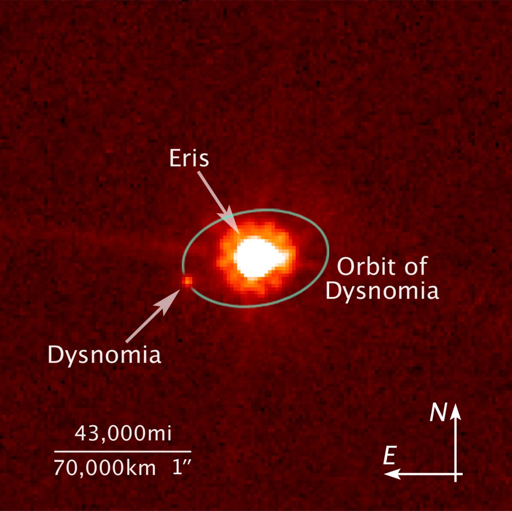 In 2005, Dysnomia (see photo) was identified, the only natural satellite of the dwarf planet Eris (the most massive of the dwarf planets in the solar system, orbiting around the Sun inside the so-called diffuse disk) using the Keck telescope in the Hawaiian Islands.