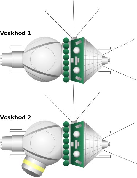In 1964, the launch of the Soviet spacecraft Voskhod 1 (see image) with three men in the crew. It consisted of a spherical reentry module (diameter of approximately 2.3 metres), which housed the crew and part of the instrumentation, and a conical module for the equipment (mass of 2.27 tons, 2.25 meters long, 2.43 meters wide), which contained the propellant and the propulsion system. Voschod was replaced by Soyuz in 1967.