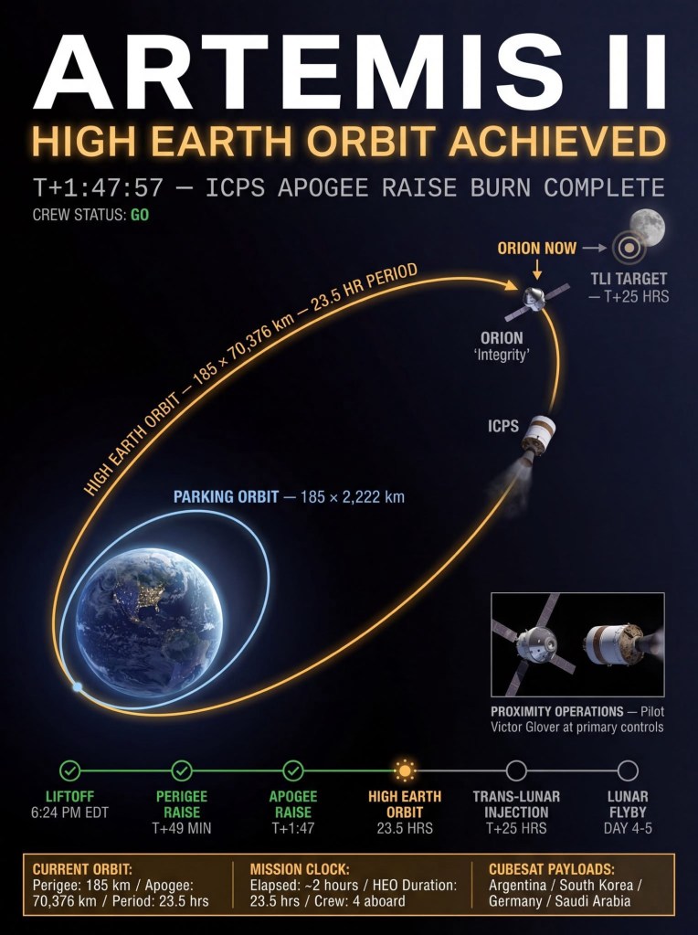 In 2026 after a successful first night in High Earth Orbit (HEO), the Orion crew is completing systems checkouts and manual flight demonstrations. Today’s main event: the Trans-Lunar Injection (TLI) burn. This critical maneuver will send Wiseman, Glover, Koch, and Hansen toward the Moon. Goodbye Earth, see you from the lunar far side!